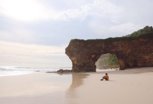Selain itu, terdapat tebing unik dengan lubang di tengah yang menyerupai gerbang. Karya alam ini menambah keindahan pemandangan Pantai Mbawana, apalagi jika kamu melihat momen ketika ombak memukul tebing-tebing dari kejauhan.